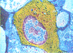 Fig. 4 : cellule eucaryote observée au microscope, recolorée artificiellement (x9.500)